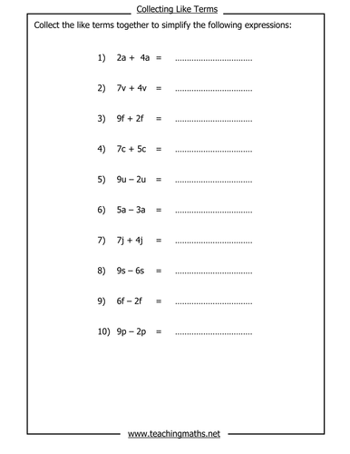 Simplifying like terms worksheet tes. Collecting Like Terms Textbook Exercise Corbettmaths. WorksheetActivity no rating 0 reviews. These printable worksheets contain algebraic expressions with positive exponents.