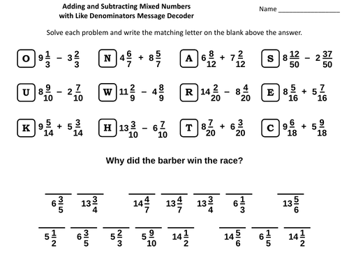 Adding And Subtracting Mixed Numbers With Like Denominators Message Decoder Teaching Resources